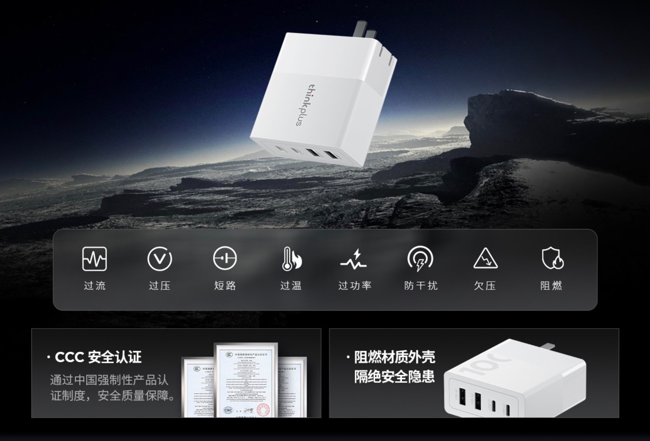 另外,根据官网介绍,thinkplus 光影系列充电器还支持多种防护设计和阻燃材质外壳,并通过了中国强制性产品认证。