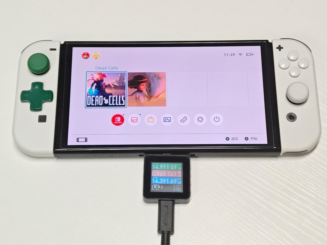 在 Switch OLED 的充电测试中,未触发快充协议,不过实际供电功率可以达到 14.9V 0.9A 14W。充电后期功率会下降到 10W 左右。