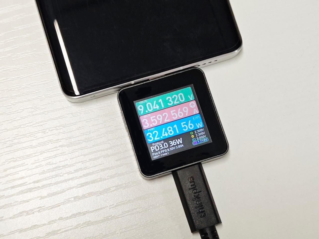 在 vivo X100 Ultra 充电测试中,触发 PD3.0 36W 充电协议,充电功率为 9V3.5A 32.4W,充电一段时间后功率下降至 27W。