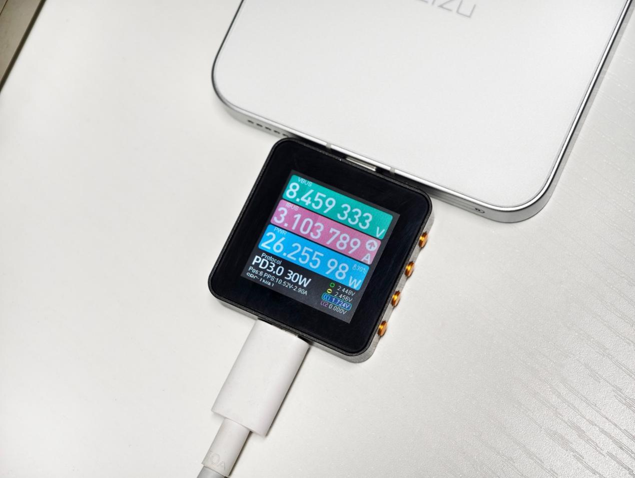 最后,小编掏出了公司仅有的一台魅族设备 —— 魅族 21,奇迹终于发生,第二个 C 口成功激活了 30W 的 PD3.0 快充协议,而且不是瞬时的。不过,实际充电功率没有实打实的 30W,大约在 26-28W 之间徘徊,但也是我们测试的设备中,唯一一台在双 C 口充电场景下,能够激活 30W PD 快充档位的设备,只能说魅族手机在充电协议兼容性上有点东西。