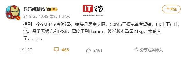 IT之家附上该微博内容如下:“摸到一个 SM8750 新折叠,镜头是居中大圆,50Mp 三摄 + 单潜望镜,6K 上下硅电池,保留无线充和 IPX8,厚度干到 8.xmm,玻纤版本重量 21xg,太哈人了….”