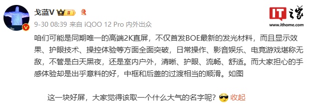 iQOO 产品经理 @戈蓝V 昨日(9 月 30 日)也在微博透露,iQOO 新机将配备高端 2K 直屏,首发京东方最新一代发光材料。