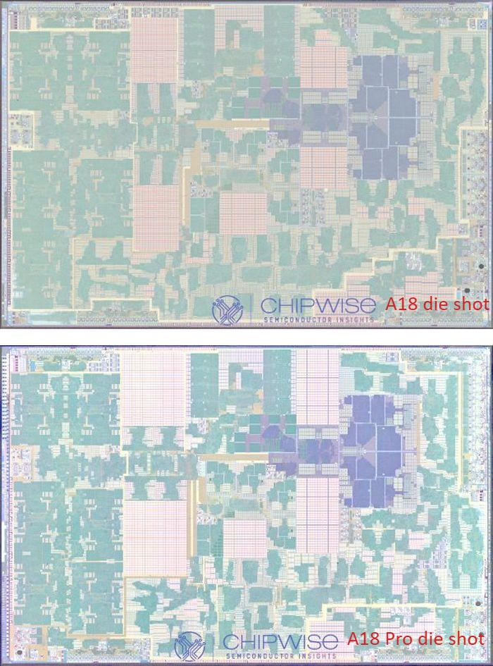 从照片中明显的差异来看,苹果似乎确实在设计和生产两种不同的芯片,而不是依赖芯片分选。