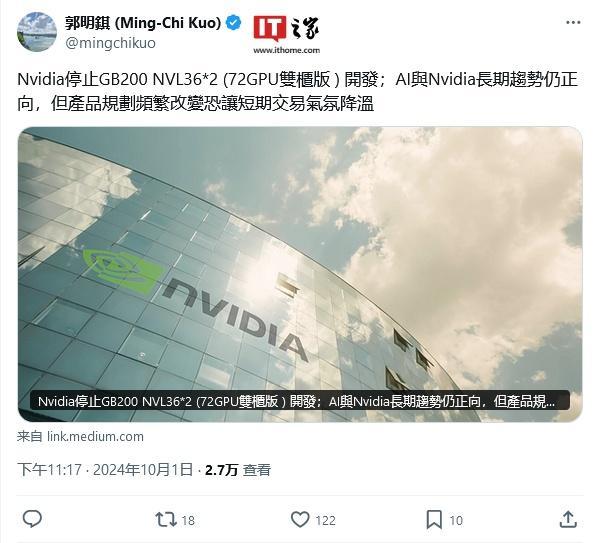 IT之家 10 月 2 日消息,郭明錤昨日(10 月 1 日)发布市场投资简报,报道称在没有客户定制要求的情况下,英伟达不再提供双柜版 GB200(2 个 NVL36),仅提供单柜版本 GB200 NVL72,而单柜版 NVL36 仍维持原开发和出货计划。