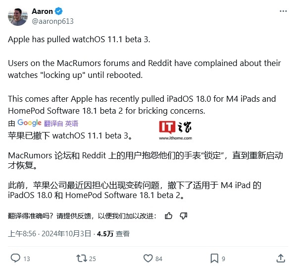 文章来源于互联网:凤凰网-苹果撤回watchOS 11.1 Beta 3更新,Apple Watch用户反馈升级后“变砖”