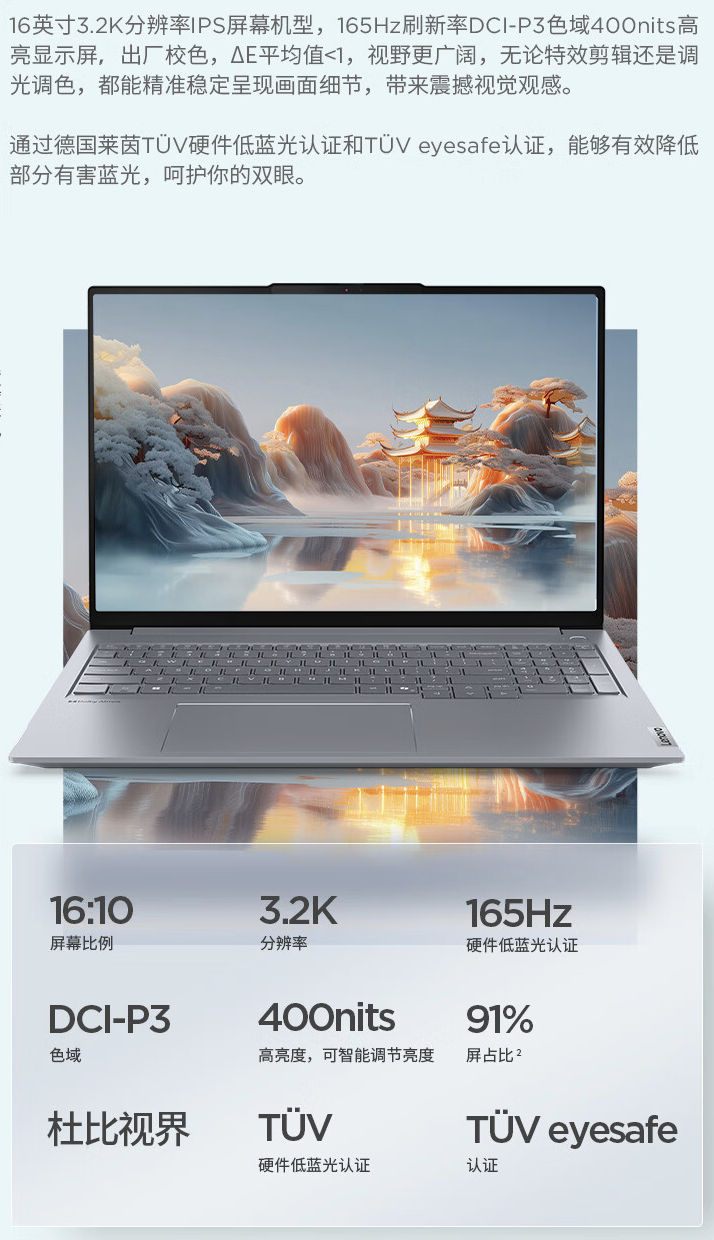 该机配备 16 英寸 3200×2000 分辨率 165Hz 面板,通过德国莱茵 TÜV 硬件低蓝光认证和 TÜV eyesafe 认证,亮度 400 尼特。