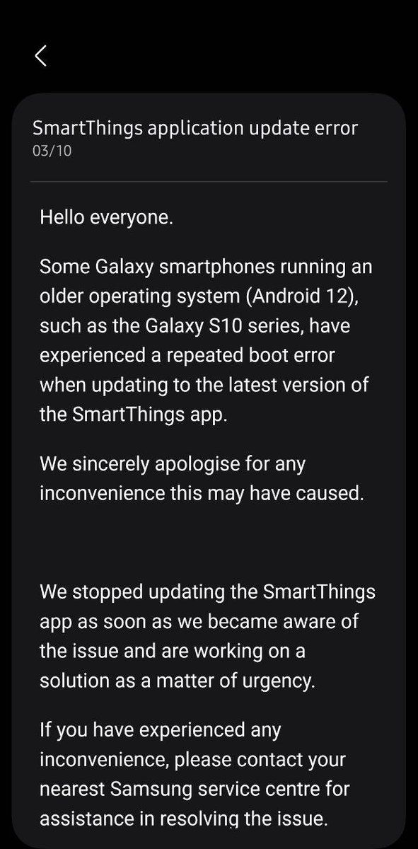 IT之家 10 月 5 日消息,在导致 Galaxy S10、Galaxy Note10 系列等旧款手机“变砖”后,三星公司承认问题原因是近期发布的 SmartThings 更新,目前已撤回本次更新,并承诺会尽快发布修复补丁。