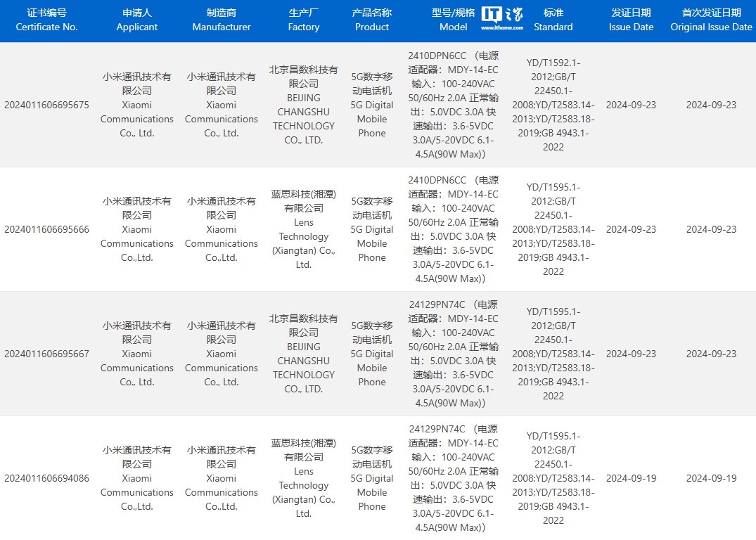 目前,小米 15(24129PN74C)、小米 15 Pro 钛金属版(2410DPN6CC)已经通过了 3C 质量认证,支持最高 90W 快充。这两款机型均由北京昌数科技有限公司、蓝思科技(湘潭)有限公司代工,均采用 MDY-14-EC 充电器(小米 13 Ultra 同款)。