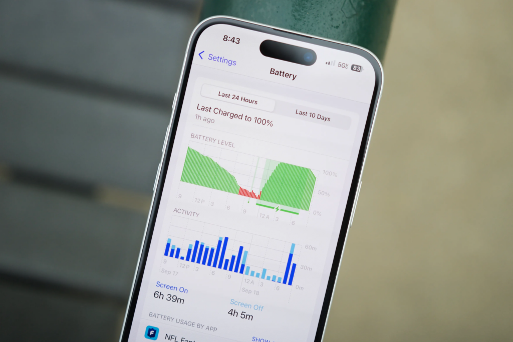 我每天平均有大約六小時的螢幕使用時間,經常使用Threads、Instagram、Snapchat和Telegram,還大量使用NFL Fantasy應用程式。如果我早上7點開始使用,到了晚上10點或11點,電量通常還剩下10%到15%。雖然這個表現稱不上驚人,但卻相當可靠。我真正想知道的是,這種穩定性能否在接下來的數週甚至數月內保持,這可不是iPhone 15系列能做到的。