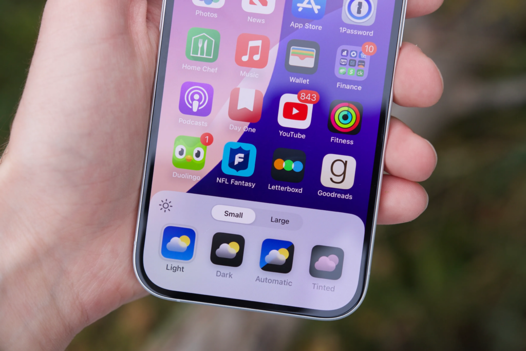 其中最顯著的升級之一是主畫面的自訂功能變得更加強大。只需長按主畫面上的空白部分,點擊左上角的「編輯」按鈕,再選擇「自訂」,你就能找到一大堆新的自訂控制選項。你可以調整應用程式圖示的大小和顏色——包括預設的淺色模式、新增的深色模式、自動模式以及色調模式。色調模式允許你將所有的應用程式圖示和小工具設定為單一的自訂顏色,雖然我個人對這種外觀並不是特別喜愛,但我相信有些人會很樂在其中。同樣地,你終於可以將應用程式圖示和小工具放置在主畫面的任意位置了。