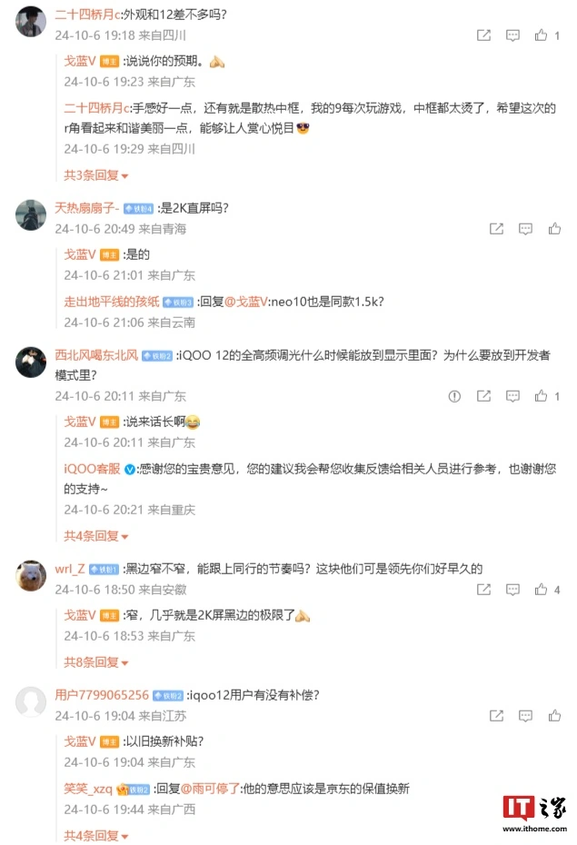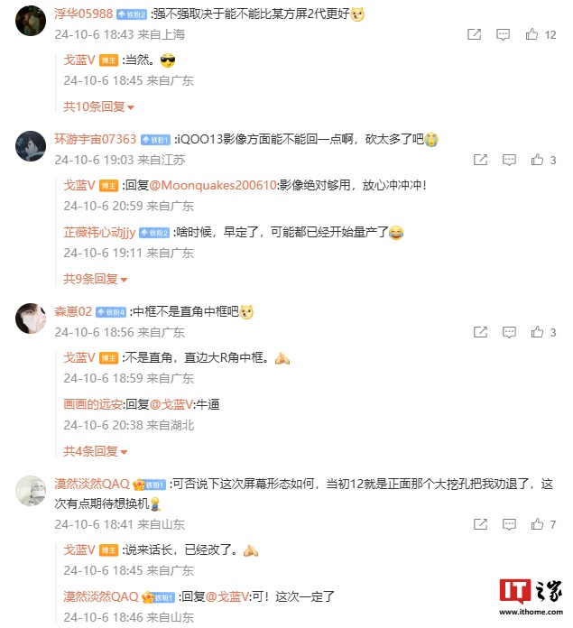 IT之家注意到,@戈蓝V 在评论区中与用户进行互动:针对新机中框设计,他表示“不是直角,直边大 R 角中框”;针对屏幕黑边问题,他称“窄,几乎就是 2K 屏黑边的极限了”;针对屏幕是否为 2K 直屏,他直言“是的”。