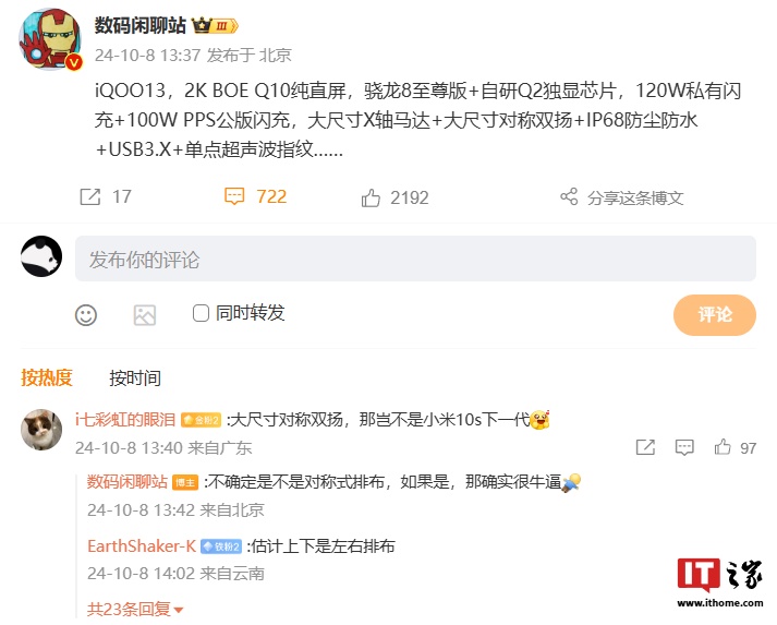 IT之家 10 月 8 日消息,iQOO 13 手机现开启早期预热,博主 @数码闲聊站 今日发文透露,iQOO13 手机将配备 2K BOE Q10 纯直屏、搭载骁龙 8 至尊版处理器 + 自研 Q2 独显芯片、支持 120W 私有协议闪充 + 100W PPS 公版闪充。
