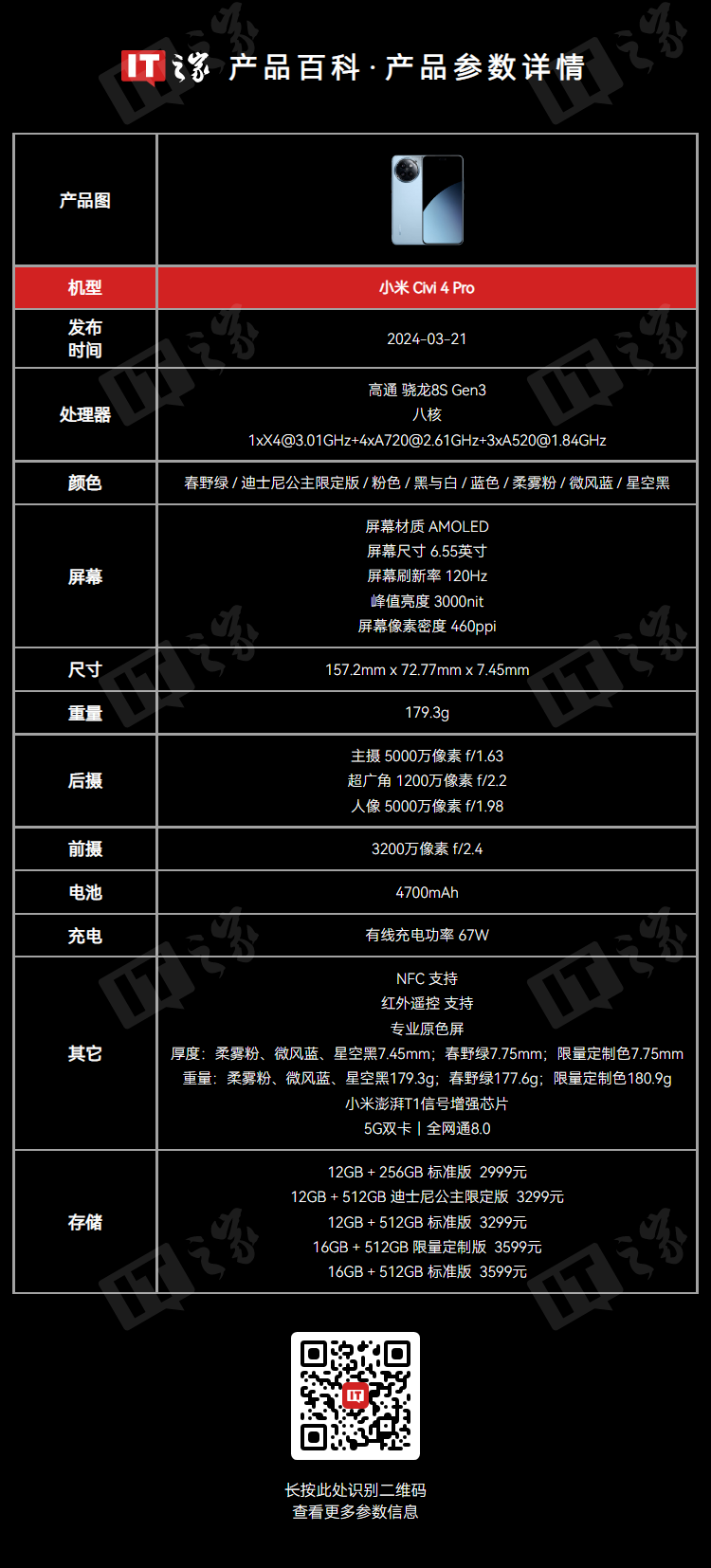 IT之家此前报道,今年 3 月小米 Civi 4 Pro 手机发布,该机首发骁龙 8s Gen3 处理器,后置徕卡三摄:50MP 主摄 + 12MP 超广角 + 50MP 人像长焦镜头。另外,该机今年 6 月还推出迪士尼公主限定版迪。