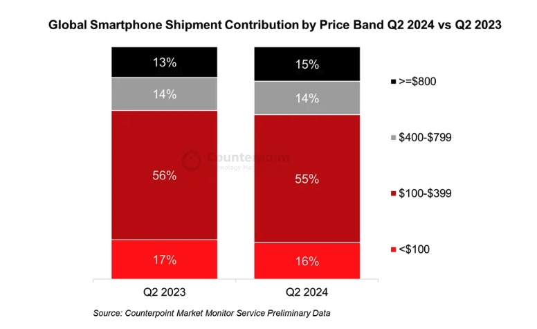 尽管这几年高端智能手机市场的增长可以说是风风火火,智能手机品牌们冲击高端的努力也有目共睹。但其实,从消费市场整体来看,千元机其实仍然是各大智能手机品牌们生存的“基本盘”。根据市场调研机构 Counterpoint Research 此前发布的 2024 年第二季度全球智能手机调研报告,今年 Q2,100 美元-399 美元价位段的智能手机市场份额依然有 55% 之多,虽然同比略降了 1%,但仍然是当之无愧的市场主流。