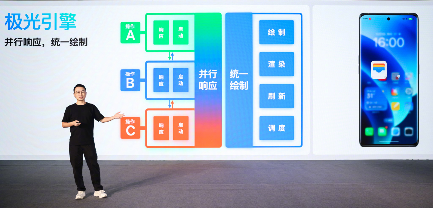 极光引擎还带来行业首个并行动画,App 图标、桌面卡片、文件夹、组件在并行的同时也支持随时打断;另外动效体验也得到升级,系统级滑动动效覆盖更多三方应用,官方称“流体云回弹动效更灵动、极限反馈动效更 Q 弹”。