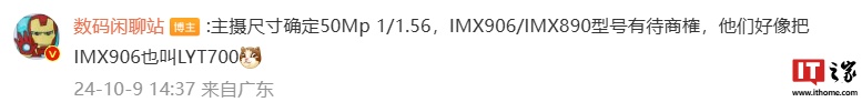随后他在评论区称,这款新机主摄尺寸确定 50Mp 1/1.56,IMX906 / IMX890 型号有待商榷。