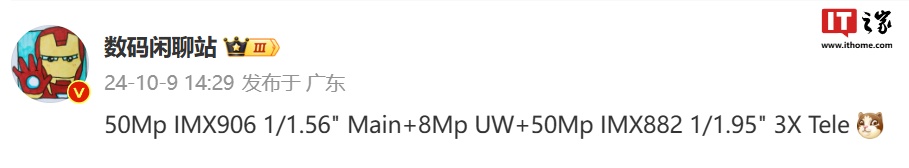 IT之家 10 月 9 日消息,博主 @数码闲聊站 今日透露,realme 新机采用 50Mp IMX906 1/1.56″主摄 + 8Mp 超广角 + 50Mp IMX882 1/1.95″ 3X 长焦。