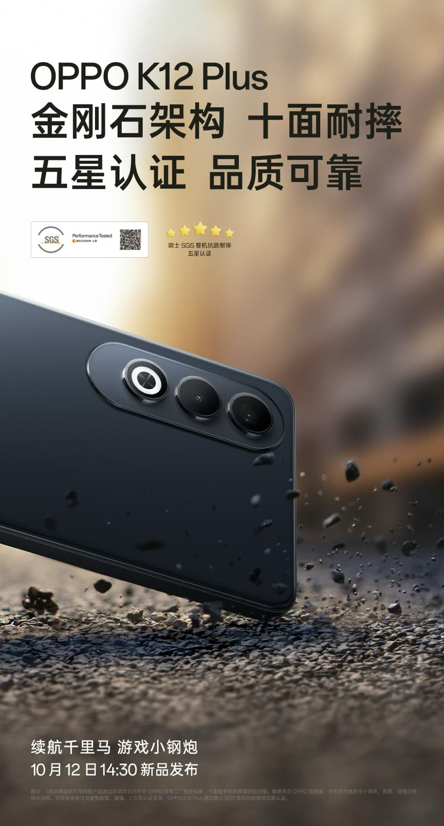 文章来源于互联网:IT之家-OPPO K12 Plus 手机预热:瑞士 SGS 整机抗跌耐摔五星认证、-20℃耐寒
