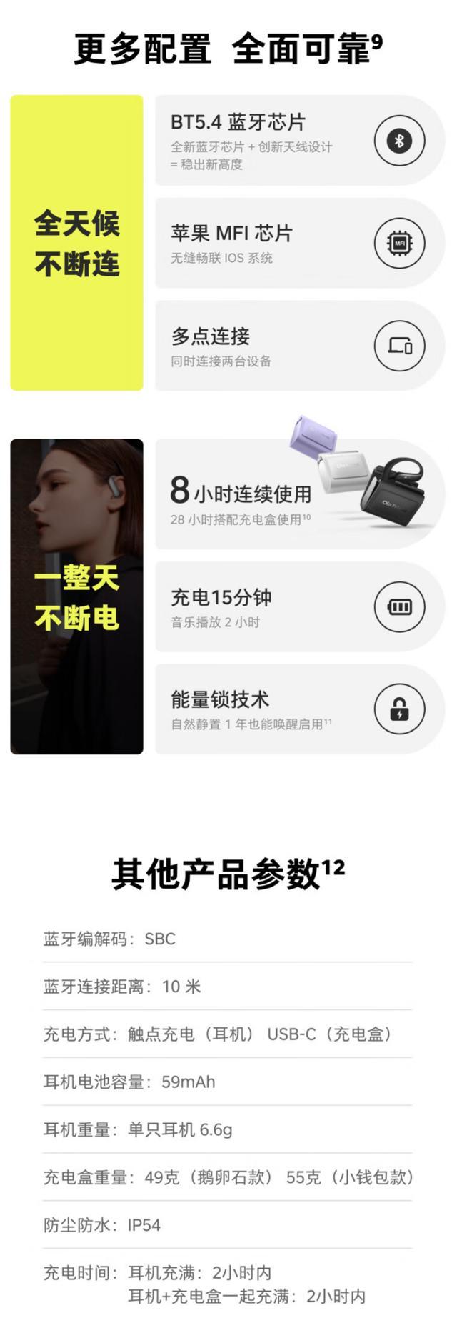 其主体部分最宽 10mm,最薄 7mm,拥有 10mm 动圈发声单元、动态 EQ1.0、动态低音补偿、定向防漏音设计等,目前有轻羽白、薄翼黑、幻梦紫、流光银四款配色及两款不同造型的充电仓。