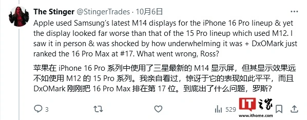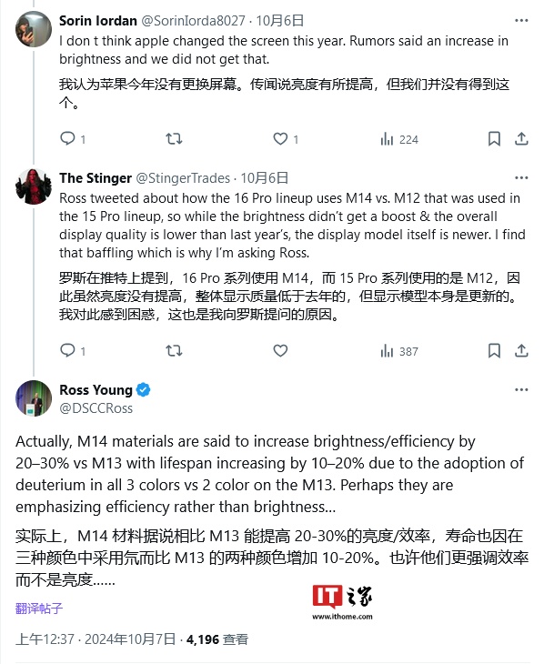 文章来源于互联网:IT之家-用户反馈 iPhone 16 Pro 显示效果不如前代,罗斯・杨:M14 面板亮度 / 能效提高 20~30%
