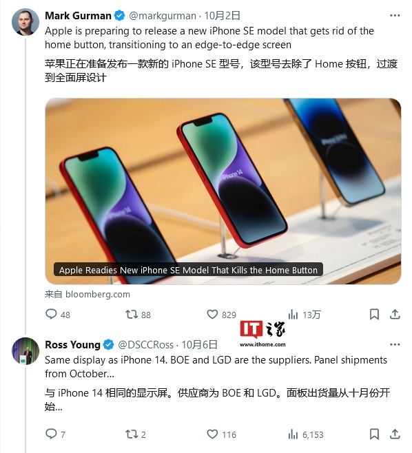 罗斯・杨随后表示新款 iPhone SE 采用和 iPhone 14 同款屏幕,供应商为京东方和 LG Display,屏幕面板将于 10 月开始出货。