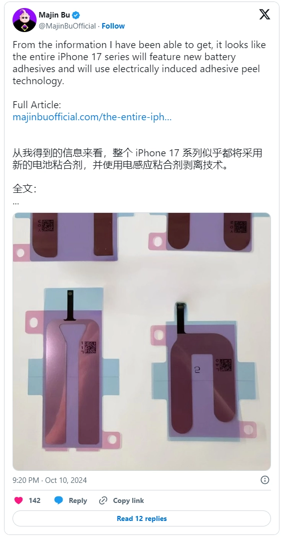 IT之家 10 月 10 日消息,爆料者 @Majin Bu 透露,苹果准备在明年推出的 iPhone 17 系列中为所有四款机型采用一种新的电池粘合剂,而目前这种技术仅适用于 iPhone 16 和 iPhone 16 Plus。