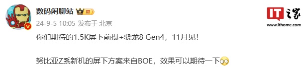 IT之家注意到,博主 @数码闲聊站 今年 9 月便爆料称,1.5K 屏下前摄 + 骁龙 8 Gen 4 新机将于“11 月见”,努比亚 Z 系新机的屏下方案来自京东方。此外,他还在评论区进一步提到了努比亚 Z70 Ultra 手机。