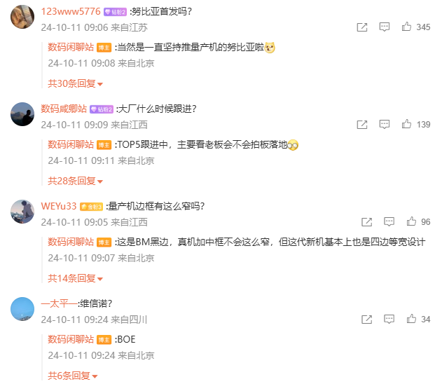 该博主透露,采用该技术的量产机下个月就可以看到。此外,他还在评论区透露,努比亚将首发搭载该屏幕,并且 TOP5 厂商也在跟进中,“主要看老板会不会拍板落地”,屏幕来自京东方。