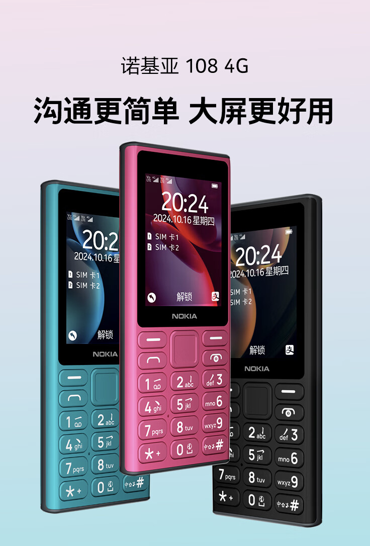 IT之家 10 月 12 日消息,HMD Global 今天在京东上架了 2024 款诺基亚 108 4G 功能机,该机主打“大屏语音播报、USB-C 接口”,可选黑 / 蓝 / 粉三色,售价为 259 元。