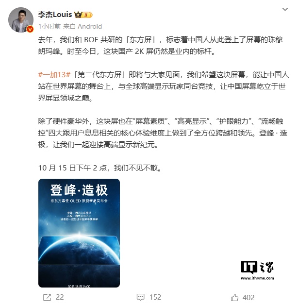 一加 13 手机“第二代东方屏”发布会 10 月 15 日召开