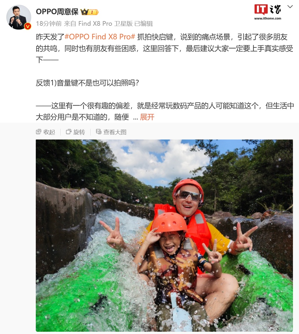 文章来源于互联网:IT之家-OPPO 周意保:大部分用户不知道音量键可以拍照,“抓拍快启键”符合直觉
