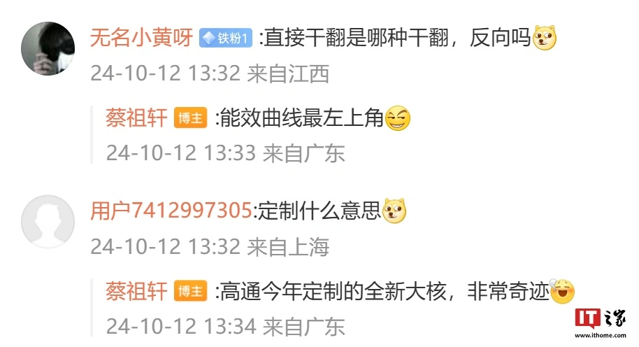 在评论里该员工表示,“高通今年定制的全新大核,非常奇迹”,位于“能效曲线最左上角(IT之家注:左上更好)”。