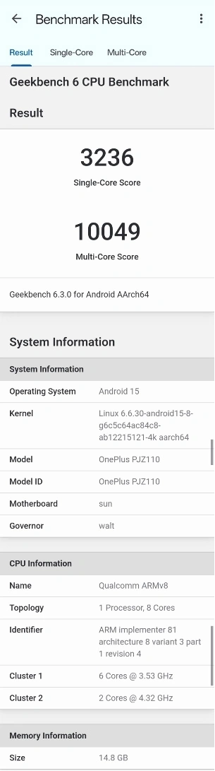 一加 13 手机 GeekBench 6 跑分成绩在 9 月时流出,该手机搭载骁龙 8 至尊版处理器,单核 3236 分,多核 10049 分。