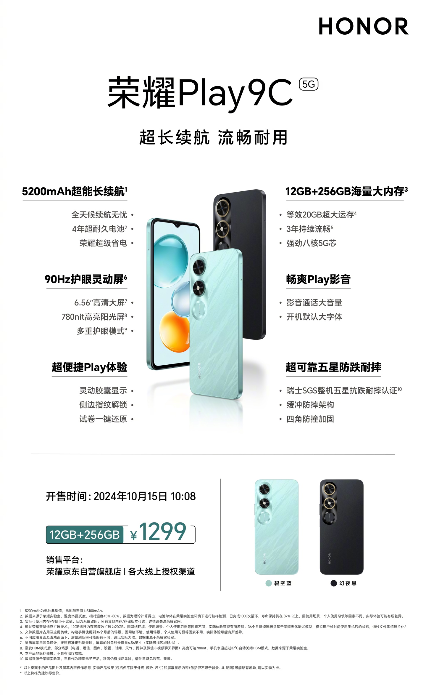 荣耀 Play 9C 提供碧空蓝、幻夜黑两款配色,机身尺寸为 163.59*75.33*8.39mm,重量为约 190 克,获得瑞士 SGS 整机五星抗跌耐摔认证。