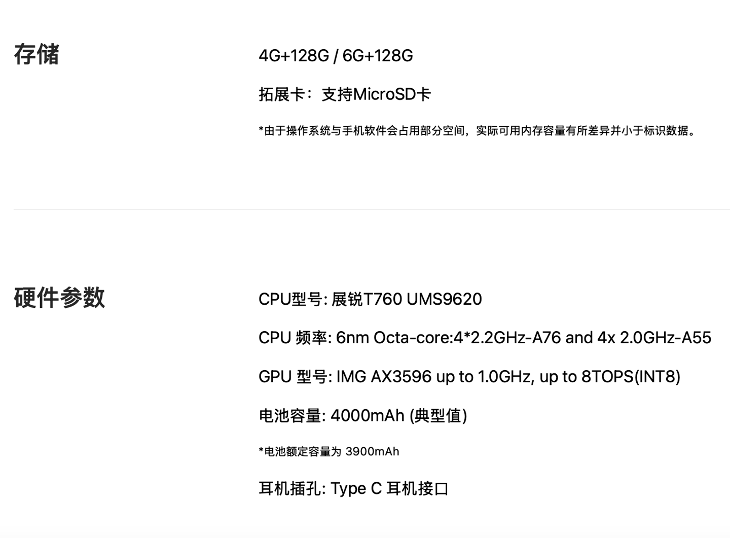 该机搭载展锐 T760 处理器,可选 4GB / 6GB RAM,内置 128GB 存储空间,搭载 4000 毫安时电池,支持 5G 全网通。