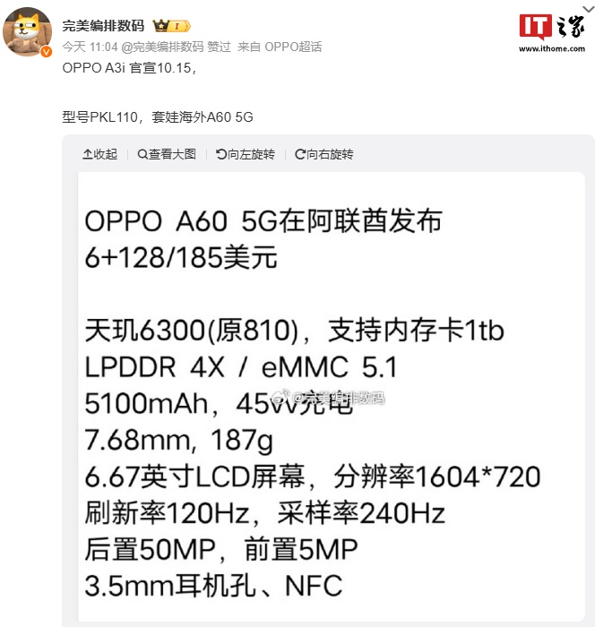 文章来源于互联网:IT之家-OPPO A3i 手机 10 月 15 日发布:5100mAh 电池 + 45W 快充