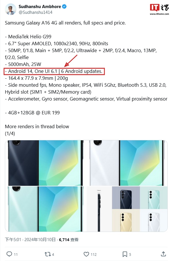 IT之家 10 月 12 日消息,消息源 Sudhanshu Ambhore 于 10 月 10 日发布博文,报道称三星计划近期推出 4G 网络版 Galaxy A16 手机,是第二款更新支持(含安卓版本和安全更新)达 6 年的入门手机。