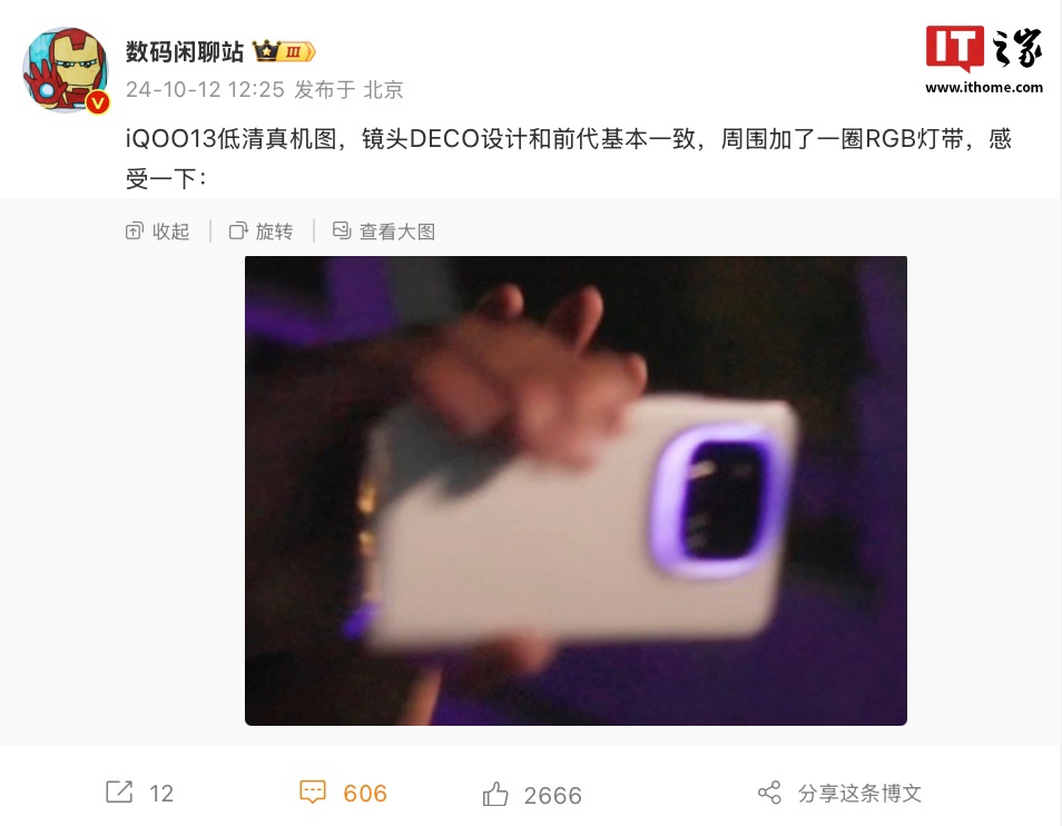 IT之家 10 月 12 日消息,博主 @数码闲聊站 今天公布了一张 iQOO 13 手机的低清真机图,镜头周围一圈类似 RGB 灯带的设计,引发网友热议。随后,该博主透露“灯带和镜头为一整块玻璃”。
