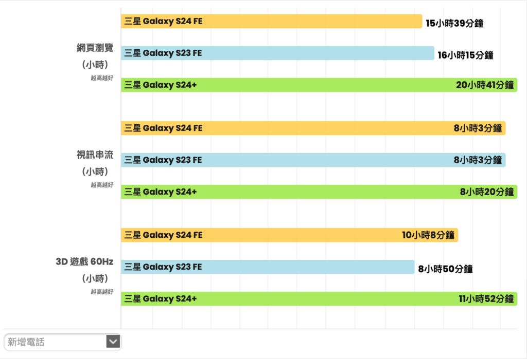 儘管 S24 FE 內部搭載了更強大的處理器,但在我們的電池續航測試中,它的表現依然優於前代。尤其是在與圖形相關的任務中,該機型在電池耗電方面表現得更加出色。這當然得益於電池容量的小幅增長,以及全新的處理器架構。