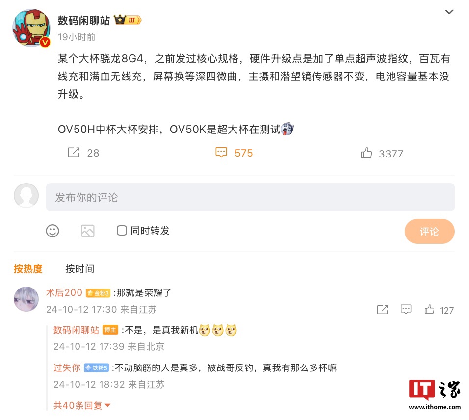 IT之家 10 月 13 日消息,博主“数码闲聊站”昨晚透露了一款神秘骁龙 8 Gen 4(高通骁龙 8 至尊版)“大杯”新机的规格信息,该机硬件方面主要升级单点超声波指纹,百瓦有线充和满血无线充,屏幕换等深四微曲,主摄和潜望镜传感器不变,电池容量基本没升级。