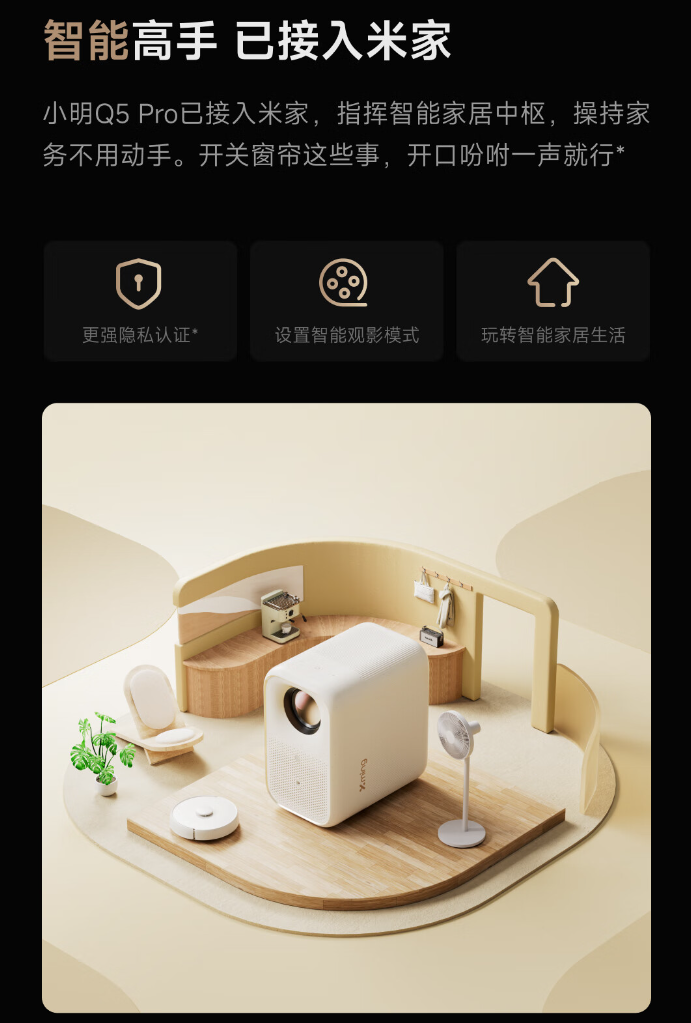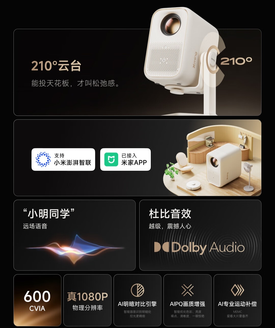 据介绍,小明 Q5 Pro 投影仪接入米家 App,支持小米澎湃智联,同时拥有“小明同学”远场语音功能。该投影仪还配备 210° 云台,官方称“可投天花板”。