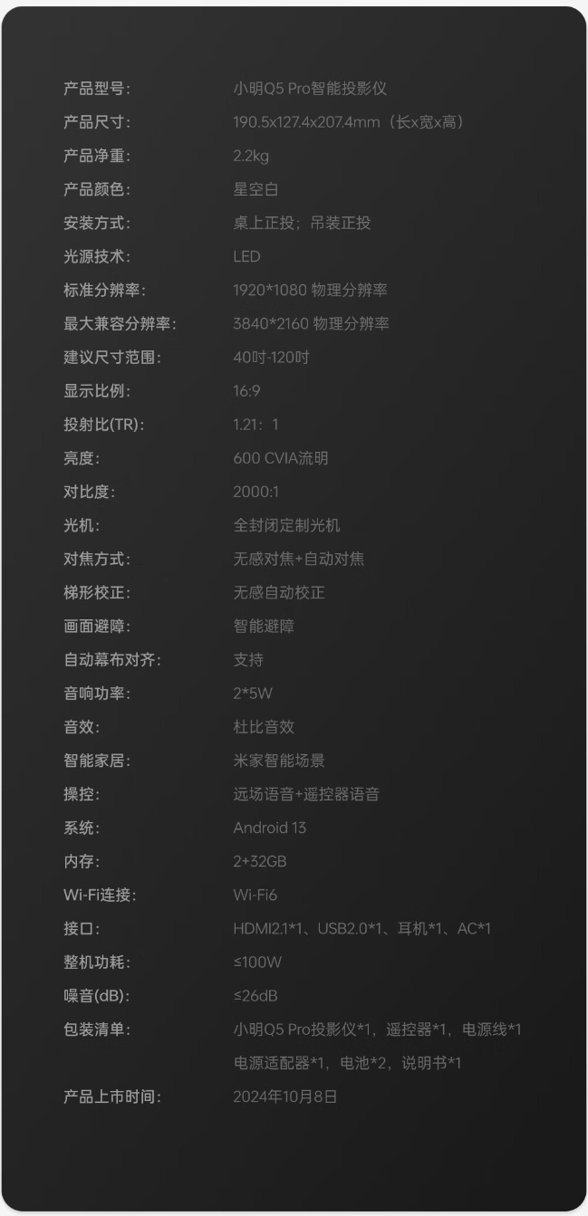 IT之家附小明 Q5 Pro 投影仪亮点及产品参数如下: