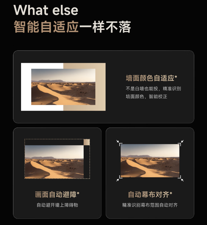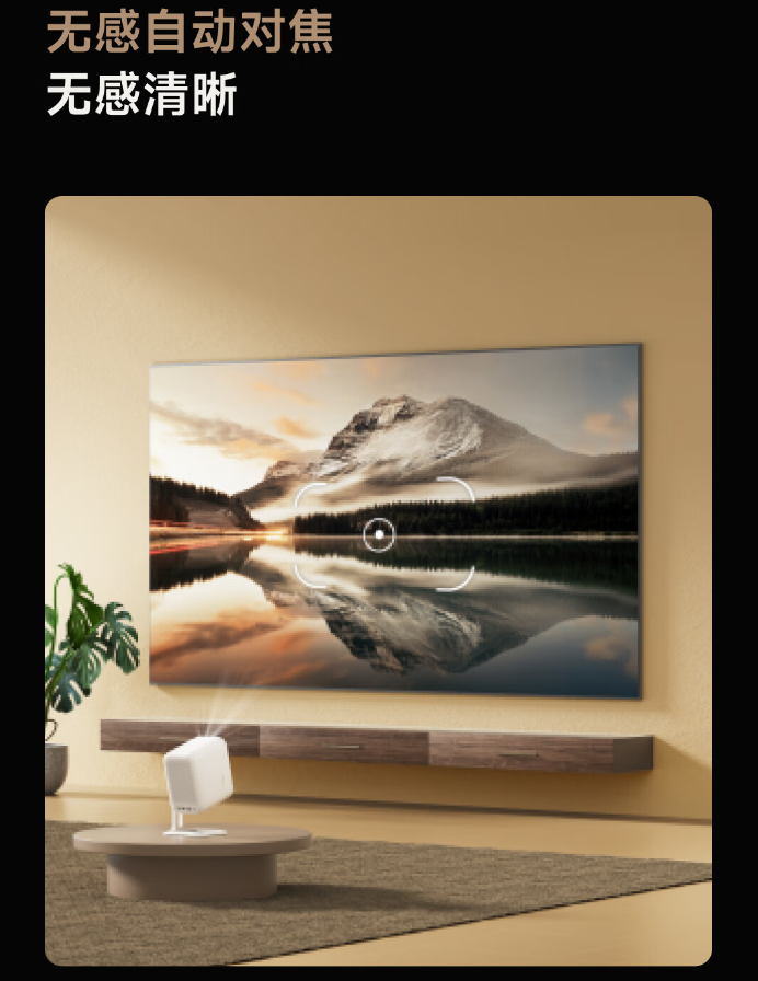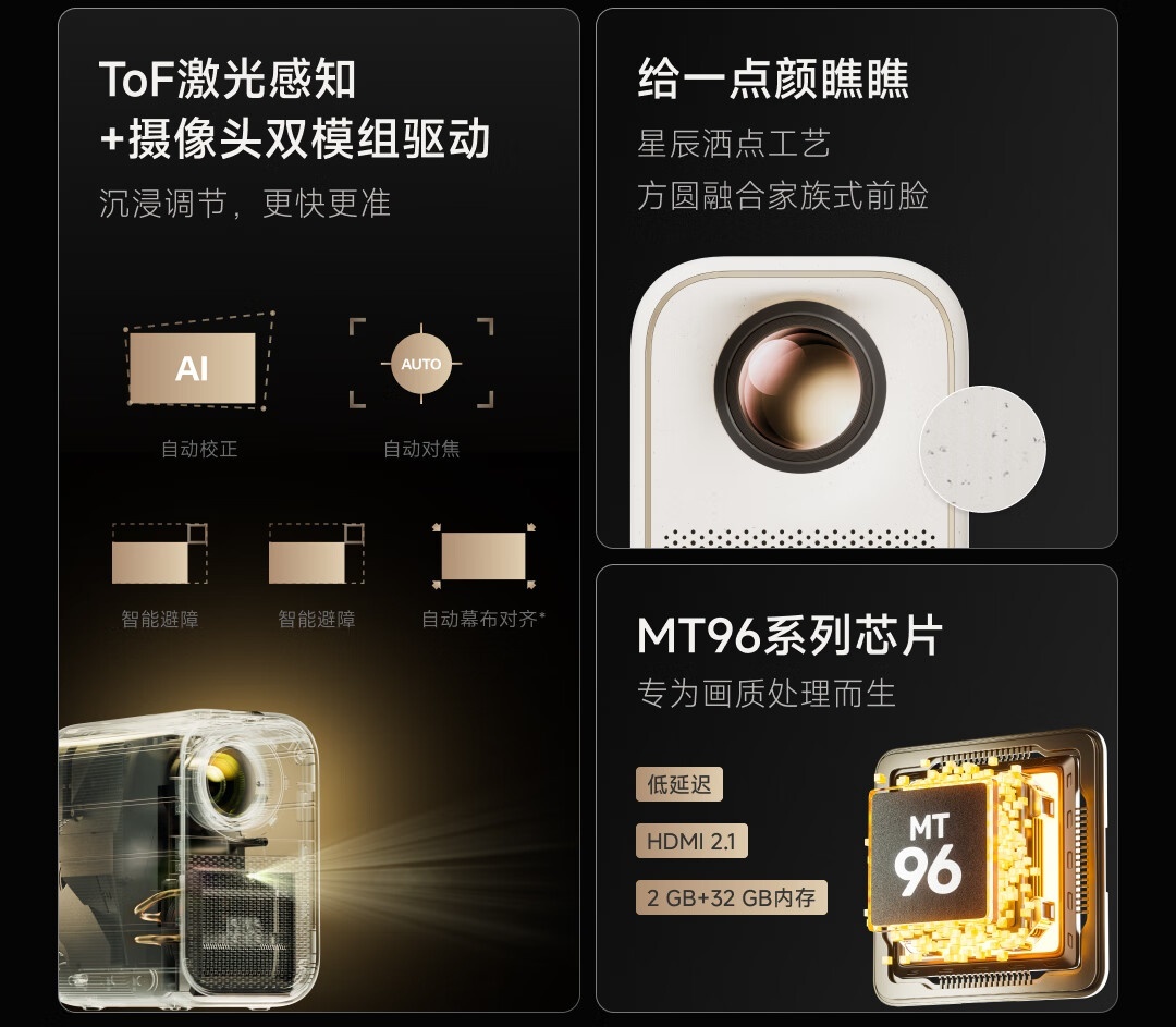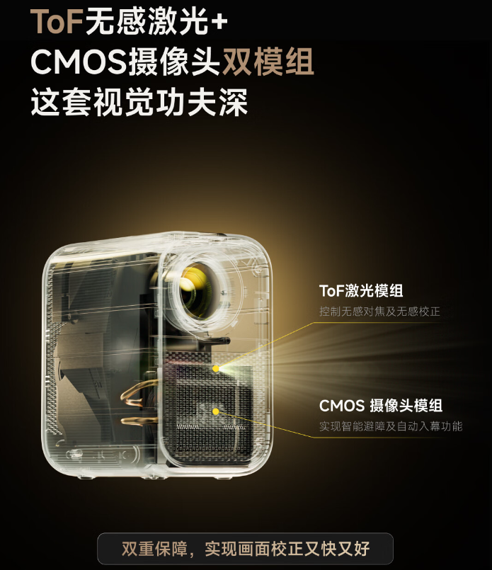 小明 Q5 Pro 投影仪配备 ToF 无感激光 + CMOS 摄像头双模组,支持无感自动对焦、全向自动校正、墙面颜色自适应、画面自动避让,以及自动幕布对齐等功能。