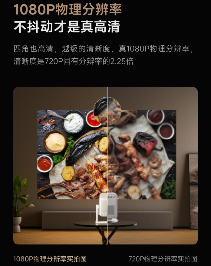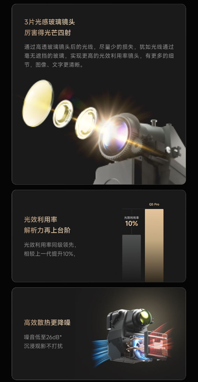 该款投影仪使用新一代 PhotonX 全封闭定制光机,防尘等级 IP5X,配备 3 片光感玻璃镜头,拥有 1080P 物理分辨率和 600CVIA 亮度,同时对比度为 2000:1。
