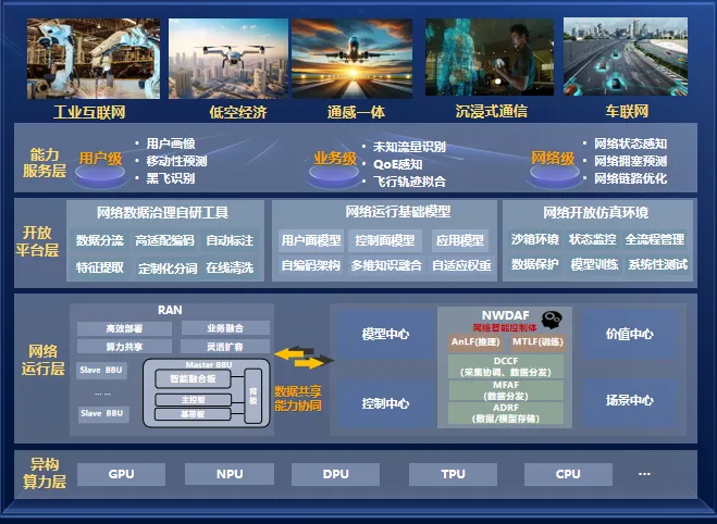 智能控制体,依托核心网 NWDAF 与无线 AI 智能融合基站,通过智能融合、数据共享与能力协同,实现对网络运行状态的全面感知、能力的按需编排以及策略的精准决策