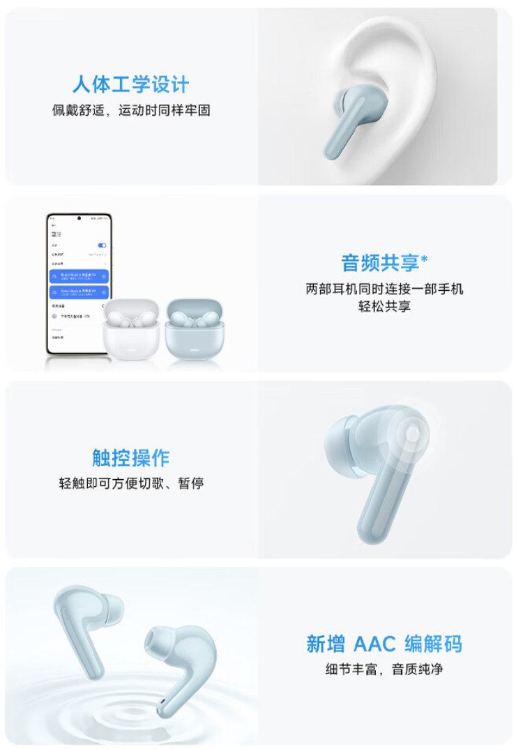 该耳机采用入耳式设计,可选蓝、白、黑三色;支持 42dB 主动降噪、双麦克风 AI 通话降噪。