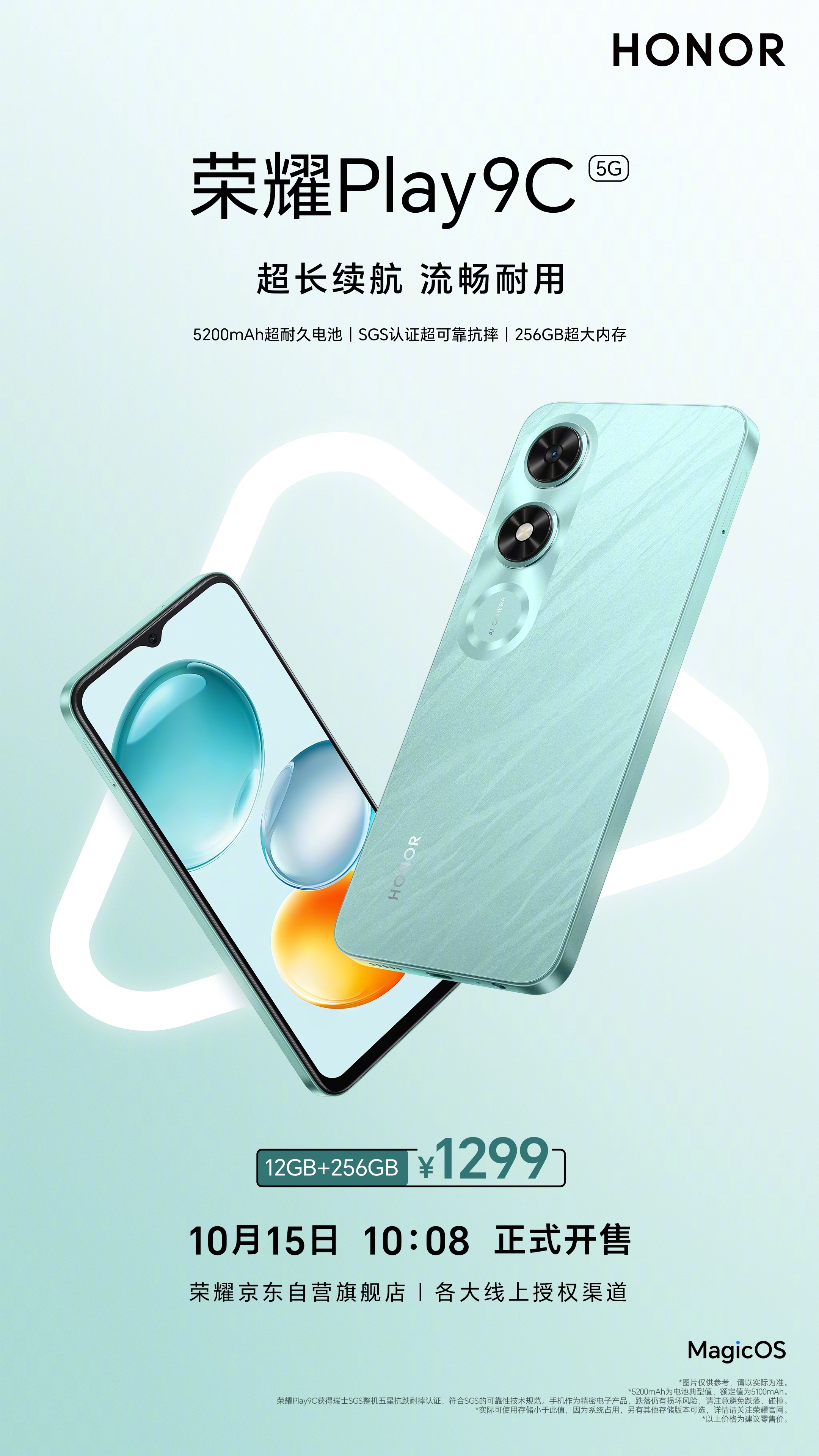 IT之家 10 月 15 日消息,荣耀 Play 9C 手机 12GB+256GB 版本今日开售,售价 1299 元。