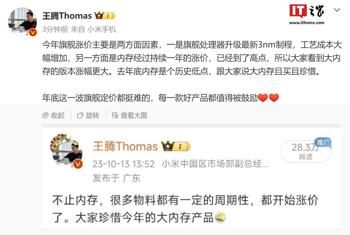 IT之家 10 月 15 日消息,小米中国区市场部副总经理、Redmi 品牌总经理王腾今日发文,解释了今年旗舰手机涨价的原因: