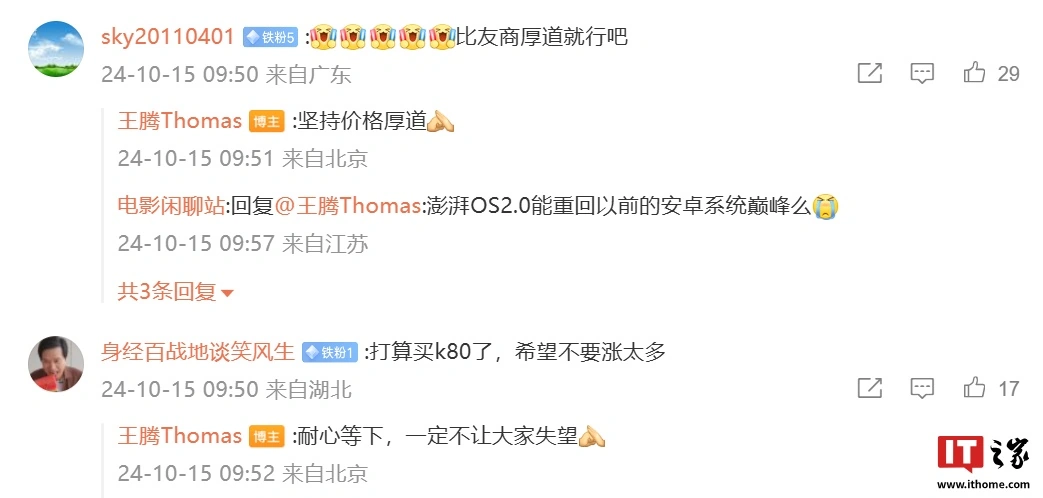 IT之家注意到,王腾在这条微博评论区表示:“坚持价格厚道”“耐心等下,一定不让大家失望”。