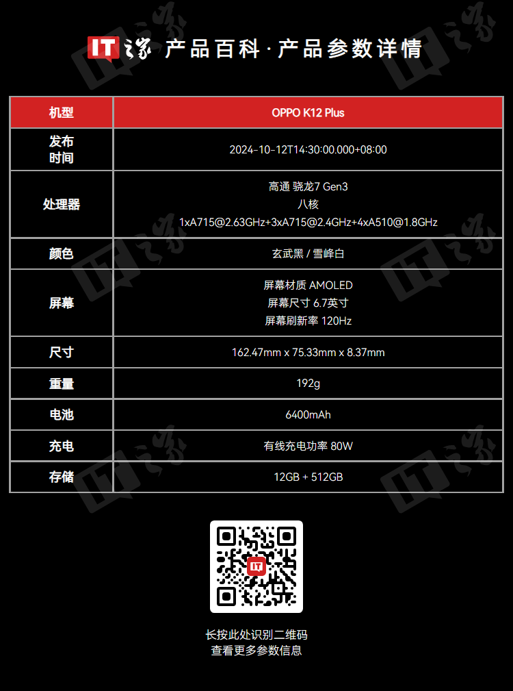 OPPO K12 Plus 手机搭载骁龙 7 Gen 3 处理器,配备 6400mAh 电池,提供雪峰白、玄武黑两款配色,机身厚度 8.37mm,重量 192g。